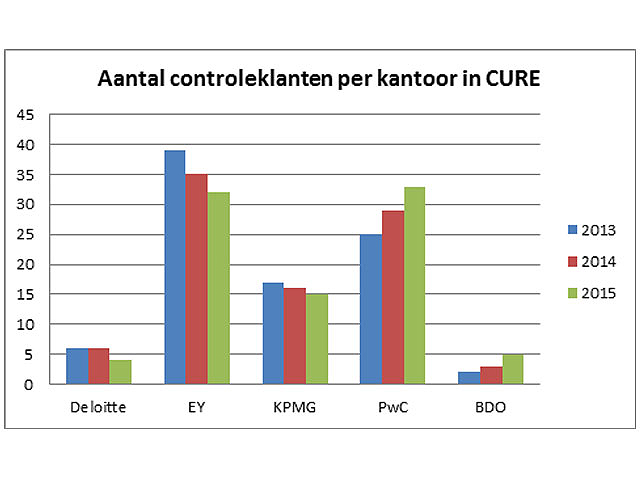 De belangrijkste kantoren zijn gevraagd naar nieuwe en vertrokken controleklanten in 2015. Dit 'plussen en minnen' bleek niet altijd eenduidig te zijn. Ook dient bedacht te worden dat, hoewel rekenkundig sluitend, er per medio december nog een aantal instellingen ontbraken, vooral GGZ-instellingen, ook na verleend uitstel tot 1 december. Sommige instellingen hebben een gemengd karakter en percentages werden afgerond. Dat doet overigens niets af aan het algemene beeld en de conclusies die daaruit te trekken zijn.