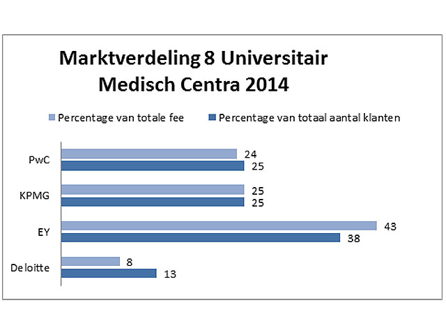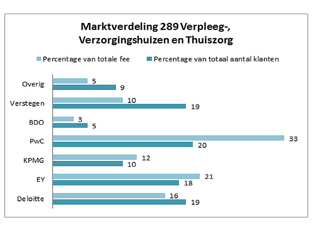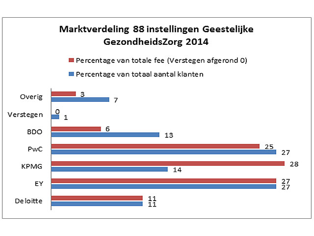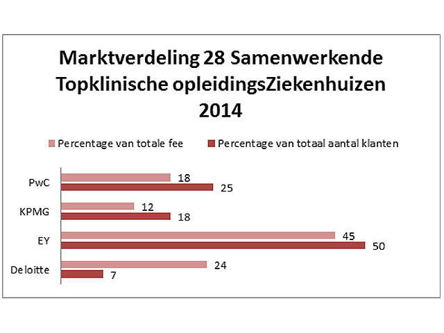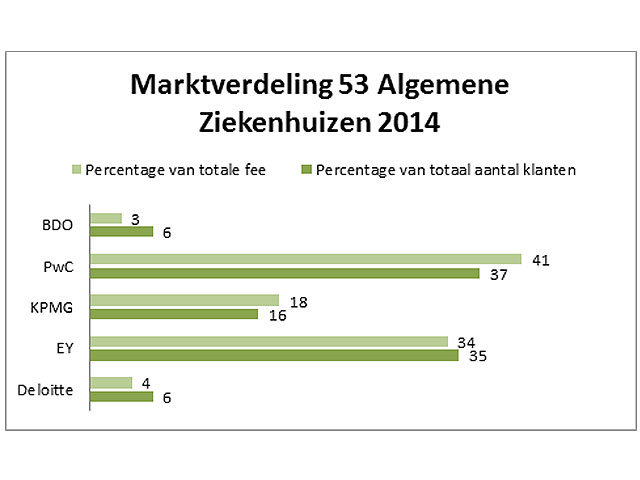 De marktposities van accountantskantoren ontlopen elkaar niet veel, gemeten naar aantal cliënten, omzet van de instellingen of het aantal fte’s. Ten aanzien van de marktverdeling gemeten naar fee's valt de positie van Deloitte op, maar die uitzondering is terug te voeren naar een forse declaratie bij een enkel STZ-ziekenhuis. Bij BDO valt de betrekkelijk lage fee op in verhouding met het marktaandeel gemeten in aantal controleklanten.