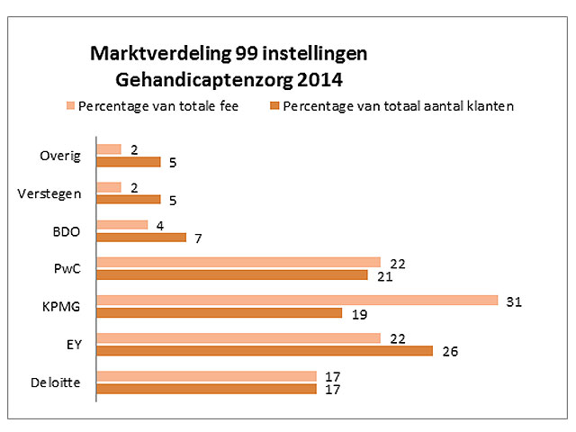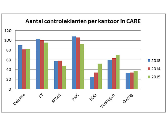In het CARE-segment vonden in 2014 51 transfers plaats: 11 procent van alle instellingen wisselde dus van accountantskantoor. De gemiddelde ‘welkomstpremie’ was 16 procent. Dat is echter een gemiddelde van extremen. KPMG en BDO gaven hoge kortingen: KPMG gemiddeld 34 procent, BDO gemiddeld 43 procent. Deloitte en EY daarentegen berekenden bij een overgang juist hogere fee's, ruim 30 procent hoger, kennelijk door extra controlewerk. Ook in CARE steeg in 2015 het aantal transfers verder, naar 66. BDO en Verstegen profiteerden daar het meeste van.