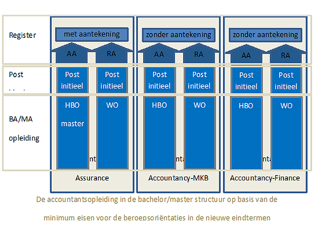 Dit is duidelijk anders voor de AA-opleiding. Nieuw voor de AA-studie is de ‘mastereis’ voor de oriëntatie assurance. De huidige AA-opleiding leidt op voor de certificerende bevoegdheid voor de wettelijke controle van jaarrekeningen. In de nieuwe AA-opleiding wordt deze bevoegdheid gekoppeld aan de studie voor een professionele master als vervolg op de hbo-opleiding. De oriëntatie accountancy-mkb blijft een post-hbo-opleiding.