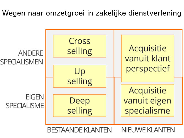 De belangrijkste bron voor groei zijn bestaande cliënten. De meeste professionals voelen zich het prettigst bij meer verkopen van dezelfde - of een daarop voortbouwende - dienst (deep selling). Het is nu eenmaal gemakkelijker iets te verkopen waar je zelf alles van weet. Bovendien kun je zo zelf controle houden over hoe de dienstverlening wordt ingevuld.