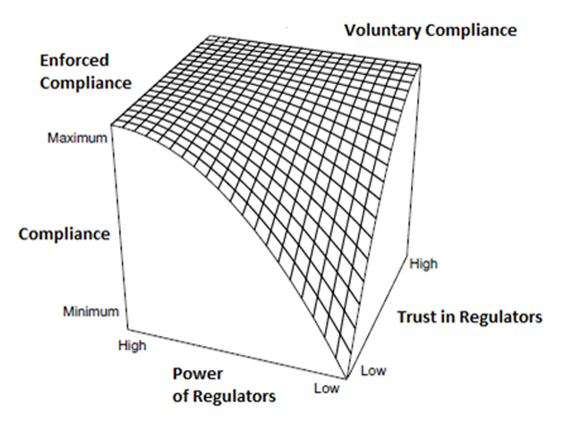 "Het evenwicht tussen toezichthouders en accountants is ingewikkeld. Het is een complex spel van vrijwillige compliance met regelgeving door de kantoren met daar lijnrecht tegenover de actieve handhaving van toezichthouders, die kantoren dwingen om compliant te zijn. Echter, hoe strenger er wordt gehandhaafd en hoe meer macht de toezichthouder heeft, hoe minder vertrouwen de kantoren hebben in de toezichthouder", zo begint Knechel zijn presentatie aan de hand van de slippery slope-grafiek.