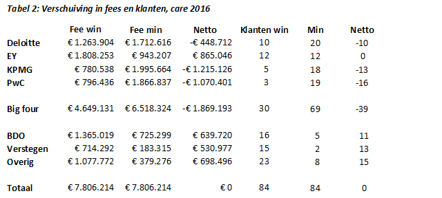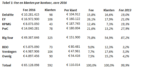 Binnen care (zorginstellingen) is het marktaandeel van de big four (Deloitte, EY, KPMG, PwC) de afgelopen jaren sterk afgenomen, ten gunste van BDO en Verstegen. Samen vormen ze in feite de big six. Maar ook overige kantoren wonnen hier flink terrein. In cure (ziekenhuizen) bleven de big four, ondanks terugval, dominant aanwezig. Alleen BDO wist te profiteren.
