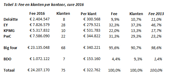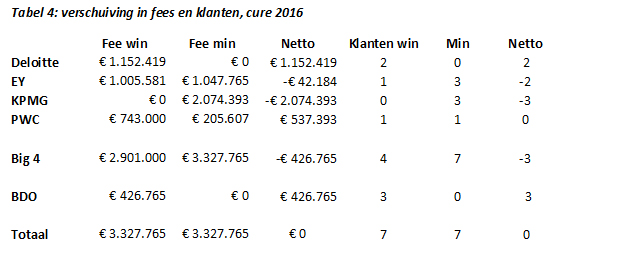 De big four wisselt kleinere klanten in voor grotere, wat ook uit de gemiddelde orderwaarde valt af te leiden. Door deze beweging groeiden BDO en Verstegen opnieuw aanzienlijk, waarbij opviel dat deze nauwelijks in elkaars vaarwater zaten. Ook 'Overig' profiteerde nadrukkelijk van deze dynamiek. Bij de 23 nieuwe klanten moet wel worden aangetekend dat deze naar negentien verschillende kantoren verhuisden.