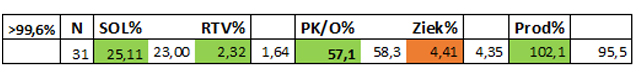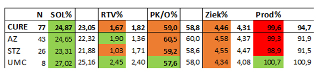 Overzicht 1 geeft een beeld van de belangrijkste financiële en personele uitkomsten. Verticaal staan onder CURE de algemene ziekenhuizen, topklinische ziekenhuizen en universitaire medische centra. Op de horizontale balk de percentages solvabiliteit SOL, rentabiliteit van het vermogen RTV, personeelskosten als deel van de omzet PK/O en het verzuim Ziek (gewogen met het aantal medewerkers). De arbeidsproductiviteit Prod is de relatieve toename in omzet per fte, gedeeld door die van de personele kosten. Is de uitkomst honderd procent, dan houden groei in omzet en personele kosten gelijke tred. Indien lager dan stijgen de personele kosten per 'kop' sterker dan omzet, en omgekeerd.
