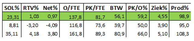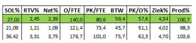 Soms worden opbrengsten en personele kosten per fte berekend, met als kpi de personele kosten als deel van de omzet, ook wel met 'personeelskostenratio' of 'loonquote' aangeduid. Deze steeg (met uitzondering van UMC's) en dat geldt ook voor het gemiddelde verzuim. Enkele ziekenhuizen noemen ook arbeidsproductiviteit, onder andere als thema van procesoptimalisatie. In overzichten 2 en 3 wordt het positieve effect becijferd van een lager dan het gemiddelde verzuim, resp. van een hogere dan gemiddelde arbeidsproductiviteit.