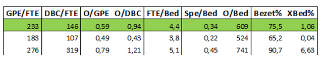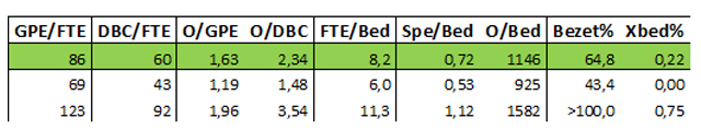Toelichting: GPE/FTE zijn de gewogen patiënt eenheden (een formule als maatstaf van productie, op basis van klinische opnames, klinische verpleegdagen, dagverplegingsdagen en eerste poli bezoeken) en DBC/FTE zijn de geopende diagnose behandel combinaties, alles per fte. O/GPE en O/DBC zijn de opbrengsten per GPE, respectievelijk DBC, in duizend euro. FTE/Bed, Spec/Bed en O/Bed staan voor medewerkers per bed, specialisten per bed en opbrengsten per bed (in duizend euro). Bezet is een schatting van het bedbezettingspercentage (berekend op basis van verpleegdagen en bedden). XBed is het percentage verkeerd bed (bedden bezet door uitbehandelde patiënten, daarmee minder opbrengsten en 'doorstroom'). De eerste rij geeft gemiddelden, in de volgende regels de bandbreedte: de laagste en hoogste notering.