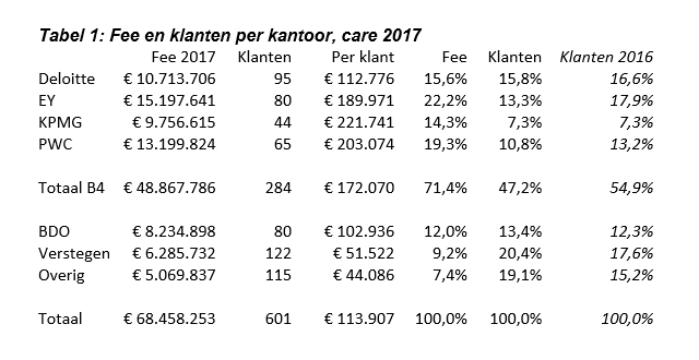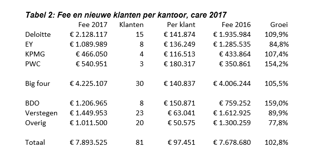 Het aandeel in de honoraria van de big four is gedaald naar 71,4 procent (in het eerdere onderzoek 75,8 procent). Het aandeel in het aantal klanten liep nog sterker terug, wat de focus van de big four op minder en grotere klanten illustreert. De nummer vijf en zes in de zorgmarkt (BDO en Verstegen) groeiden opnieuw fors. Het aantal klanten van overige kantoren steeg ook flink, maar bijzonder is dat de fee van € 5.069.382 lager was dan een jaar eerder. Wel meer, maar kleinere klanten. 'Overig' omvat ruim vijftig verschillende kantoren. Met 115 klanten betekent dat gemiddeld nauwelijks meer dan twee relaties; maar weinig kantoren tellen tussen de vijf tot tien zorgklanten. Hoewel hier niet verder uitgewerkt geldt dit ook voor vele honderden kleinere zorginstellingen, zoals zorgboerderijen, ZBC's en in de thuiszorg: kennelijk speelt de locatie ('de accountant om de hoek') voor kleine instellingen een hoofdrol.