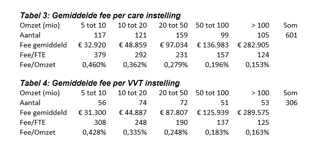 Het leeuwendeel van de care sector wordt gevormd door VVT-instellingen. De uitkomsten hierboven wijken weinig af van tabel 3. De grootte van de organisatie is daarmee maatgevend voor de fee, hoewel de spreiding in de kosten voorspelbaar groot is. Een praktijksituatie verdient daarom een nauwkeuriger vergelijk (naar type instelling, omvang, regio) en kan helpen bij de selectie en referentie onderzoek.