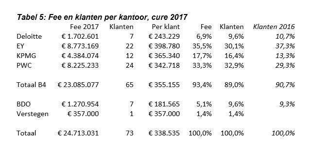 De praktijk leert dat tijdige beschikbaarheid van passende accountancydiensten zwaarder weegt dan eventuele 'welkompremies'. De hoogte van het honorarium wordt uiteraard primair bepaald door de zwaarte van de opdracht en hangt verder af 'van wie naar wie', met de daarbij gehanteerde tarieven. Zo viel bij EY (na verder onderzoek) op dat alle acht nieuwe klanten eerder ook big four klant waren. Bij Verstegen betrof het 21 van de 23 en bij Overige kantoren vijftien van de twintig klanten.