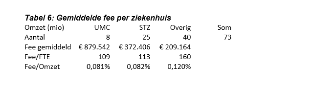 Ten behoeve van wat verder inzicht werden de 25 STZ-ziekenhuizen opgesplitst in kleiner en groter dan € 450 miljoen omzet en daarmee dertien respectievelijk twaalf stuks. De fee, omgerekend naar fte of omzet, week minimaal af. Een opdeling van de 40 overige ziekenhuizen in kleiner of groter dan € 150 miljoen leverde achttien respectievelijk 22 stuks op. De corresponderende fee/fte: 236 respectievelijk 135, zijnde 0,172 procent respectievelijk 0,102 procent van de omzet.