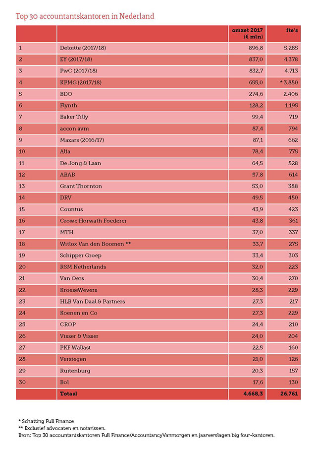 De onderzochte kantoren zijn Deloitte, EY, PwC, KPMG, BDO, Flynth, Baker Tilly, accon avm, Mazars, Alfa, De Jong & Laan, ABAB, Grant Thornton, DRV, Countus, Crowe, MTH, Witlox, Schipper, RSM Netherlands, Van Oers, KroeseWevers, HLB, Koenen en Co, Crop, Visser & Visser, PKF Wallast, Verstegen, Ruitenburg en Bol.
