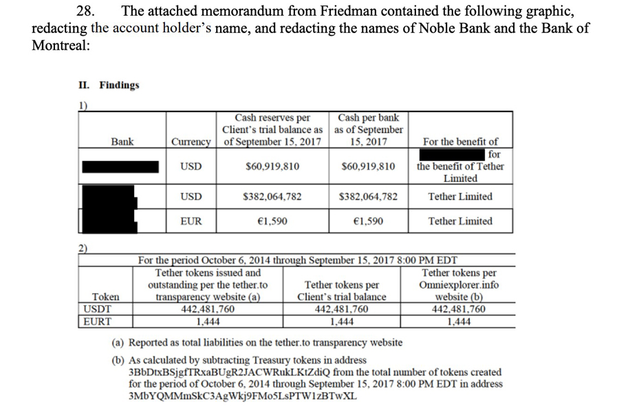Ter illustratie het volgende. Voor 2017 hield Tether rekeningen aan bij in Taiwan gevestigde banken. Wells Fargo fungeerde als 'correspondent bank', maar staakte die activiteit ten behoeve van Tether in 2017. Tether hield daarna in eerste instantie slechts een bankrekening aan bij de Bank of Montreal, waar maximaal US $ 61,5 miljoen op de rekening heeft gestaan, terwijl ruim 442 miljoen tethers waren uitgegeven. Uit de schikkingsdocumenten van het Amerikaanse OM blijkt: "Between June 1, 2017 and September 15, 2017, Bitfinex held approximately $ 382 million of Tether’s funds in a comingled [gemeenschappelijk] account, which should have been held by Tether as 'backing' for tethers then in circulation but was not."