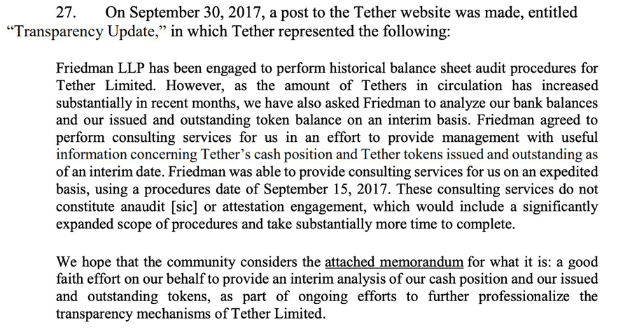 "The September 30, 2017 'Transparency Update' and the attached memorandum were misleading. At no point did Tether inform its clients or the market that from at least June 1, 2017 until September 15, 2017, tethers were not in fact not backed '1-to-1' by USD held by Tether in a bank account.