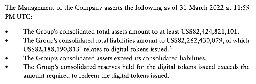 Waar het in 2017 'slechts' ging om US $ 442 miljoen, in maart 2022 gaat het om ruim US $ 82 miljard!!! Maar ook inzake dat bedrag tekent een accountant de documentatie van Tether doodleuk af. Het Consolidated Reserves Report (CCR) de dato 31 maart 2022 van Tether wordt afgetekend door accountantskantoor MHA Cayman, onderdeel van het internationale Baker Tilly-netwerk.