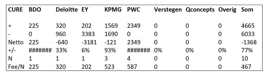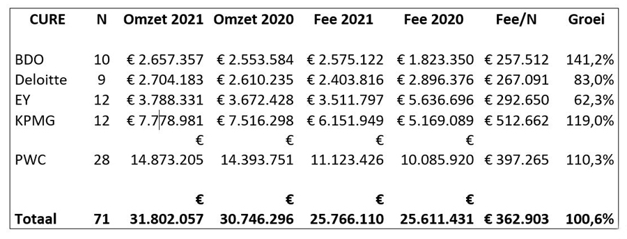 Ultimo december 2022 werd er nog gerapporteerd over 2021. Met een ondergrens vanaf 10 miljoen euro omzet over 2021 ging het in CURE om 71 organisaties met een totale omzet van 31,8 miljard en bijna 26 miljoen fee (honoraria voor accountantsdiensten).