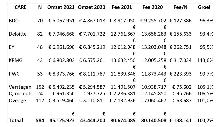 CARE telde 584 instellingen met 45 miljard omzet en ruim 80 miljoen aan fee. Met een totaal van 655 organisaties en 77 miljard (met 13 procent van alle instellingen wordt circa 77 procent van de omzet afgedekt) kan daarmee een representatief beeld van de zorg en de betrokken accountants worden geschetst, zoals in onderstaande tabellen weergegeven.