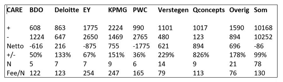 In CURE ging het primair om 'stuivertje wisselen' tussen de big four, met BDO als het enige alternatief. In CARE won BDO vijf nieuwe klanten, waarvan vier ex big four. Deloitte ontmoette alle kantoren; EY bijna alleen big four en vooral PwC. KPMG kruiste de degens met PwC en Deloitte. PwC concurreerde vooral met de andere van de big four. Van de veertien nieuwe klanten van Verstegen waren er zes ex big four en vier ex overig. QConcepts streed voornamelijk met BDO en Deloitte.