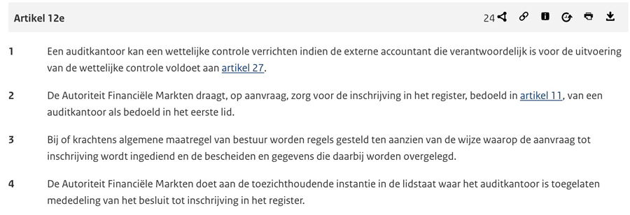 De constructie mag dan nieuw zijn en om het grote misbruikrisico worden bekritiseerd door de hoofdredactie van het FD en door Marcel Pheijffer, de mogelijkheid van de route heeft de zegen van de AFM. De route is dan ook verankerd in Artikel 3 van de Europese Richtlijn 2006/43/EG van 17 mei 2006 en sinds 2017 in Artikel 11 en 12 van de Wta. In die laatste wet is ook vastgelegd dat de externe toezichthouder AFM een apart register bijhoudt van kantoren uit derde lidstaten die zijn toegelaten tot de Nederlandse markt.