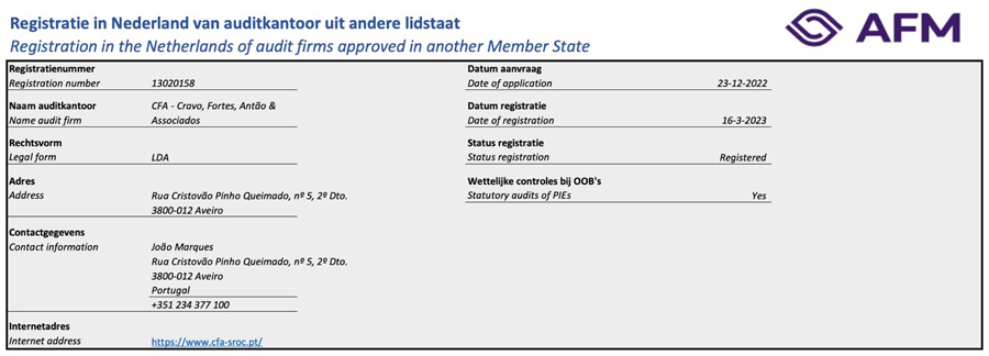 Dat soort registers bestaan bij alle Europese toezichthouders over de financiële markten. Het AFM-register 'Auditkantoren uit andere lidstaten' was tot maart 2023 leeg. Datzelfde geldt nog steeds voor bijvoorbeeld de registers in België, Duitsland en Frankrijk. Ook de externe toezichthouder van Portugal heeft geen kantoren van buiten dat land opgenomen in het eigen register auditkantoren uit andere lidstaten. Het lijkt er daarmee op dat Nederland de primeur te beurt valt, nu er sinds maart één kantoor staat opgenomen in het register alhier, namelijk het Portugese CFA.
