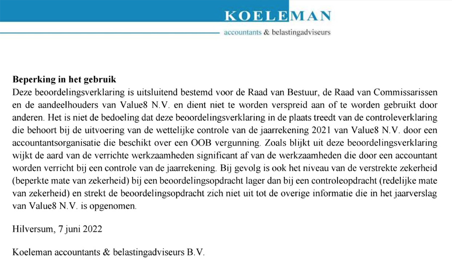 De precieze kostenpost is niet bekend, maar zeker is dat een aantal accountancy-experts veel uren stak in het juridisch toedekken van de tekst. Dat blijkt ook bij lezing van de tekst, die benadrukt dat de beoordelingsverklaring geen vervanging voor de wettelijke controleverklaring betreft. De brief is verstrekt door accountantskantoor Koeleman, gericht aan bestuur en commissarissen en door Value8 gehecht aan de jaarrekening 2021. Let wel: Niet de gewone openbare jaarrekening die bij de AFM is gedeponeerd als XHTML-bestand, maar een aparte jaarrekening met bijlage die alleen te downloaden is voor wie een hokje aanvinkt waarmee diegene bevestigt zelf aandelen Value8 te bezitten. Bovenaan de verklaring staat in kapitalen geschreven 'STRIKT VERTROUWELIJK'. De verklaring sluit af met de volgende tekst: