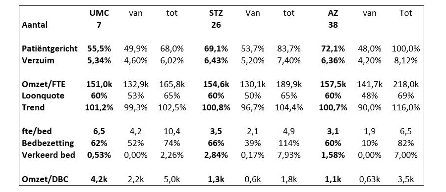 Patiëntgerichtheid lijkt, gemiddeld genomen, geen onderscheiden maatstaf en verzuim evenmin. Nader onderzoek leert wel dat bij enkele organisaties een al laag verzuim in het volgende jaar soms nog verder daalde, maar omgekeerd ook. Verschillen in bed gerelateerde cijfers vallen evenmin op.