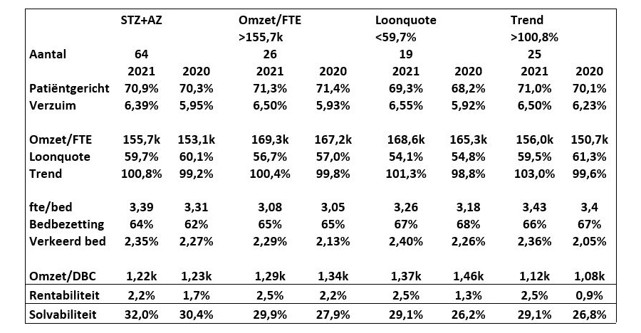 In het volgende overzicht een meerjarig vergelijk van STZ- en AZ ziekenhuizen, totaal 64. Elk ziekenhuis acht zich uniek gezien de locatie, het adherentie gebied, specialismes en behandelingen, complexiteit etc. Gekozen is voor doorsnedes op drie belangrijke prestatie-indicatoren: een bovengemiddelde omzet/fte, onder gemiddelde loonquote en bovengemiddelde trend. Dit om het (voorspelbaar: significante-) meerjarige effect ervan na te gaan, ook op de bottomline.
