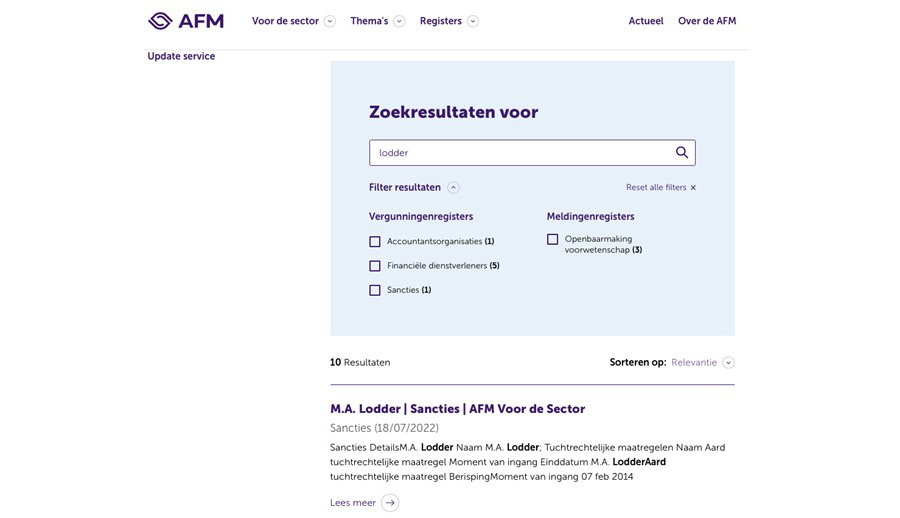 Desgevraagd laat Lodder zelf weten dat er geen "tuchtmaatregelen zijn geregistreerd" tegen hem. Een foutje op de site van de toezichthouder?