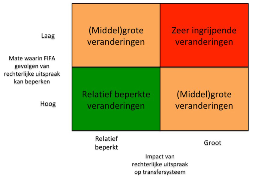 Het is verstandig dat clubs alvast nadenken over de nieuwe situatie, zodat er plannen klaarliggen als die zich voordoet. Er zijn echter de nodige onzekerheden. Wat wordt het effect van de uitspraak van het Europees Hof? In hoeverre slaagt de FIFA erin om de gevolgen te beperken? Scenario's kunnen helpen in tijden van onzekerheid. Zie figuur 2. Het rode vlak vraagt om de meest ingrijpende maatregelen en het groene om de minste. De beide oranje vlakken zitten daar tussenin.