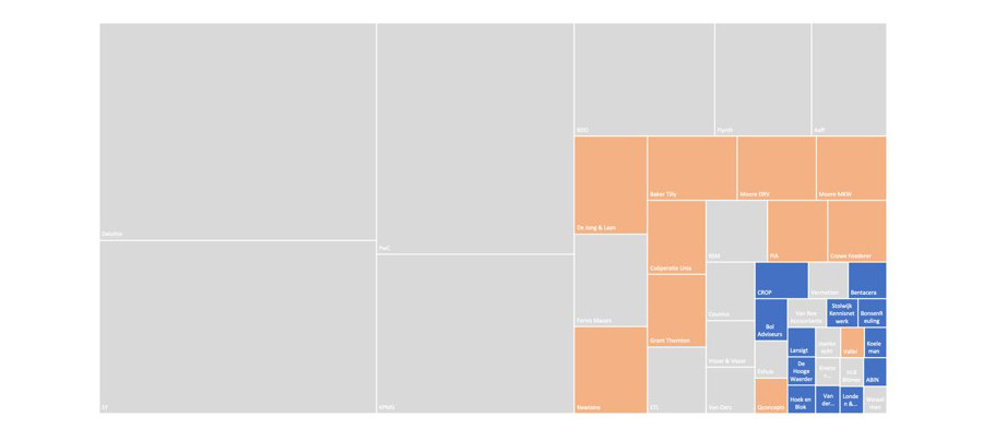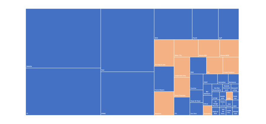 De grootste accountantskantoren, gerangschikt naar omzet, met in blauw de resterende potentiële verkopende kantoren.