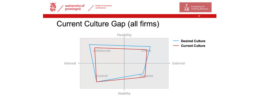 Bik spiegelt dat aan de onderzoeksresultaten met negen Nederlandse accountantsorganisaties, waaronder de big four, dat hij met hetzelfde onderzoeksteam deed. "Samenvattend: samenwerking en controle - beiden aan de interne focus-kant - zijn het meest dominant in de huidige cultuur. In de gewenste cultuur willen mensen graag minder concurreren zien (gericht op stabiliteit) en meer creëren (gericht op flexibiliteit)."