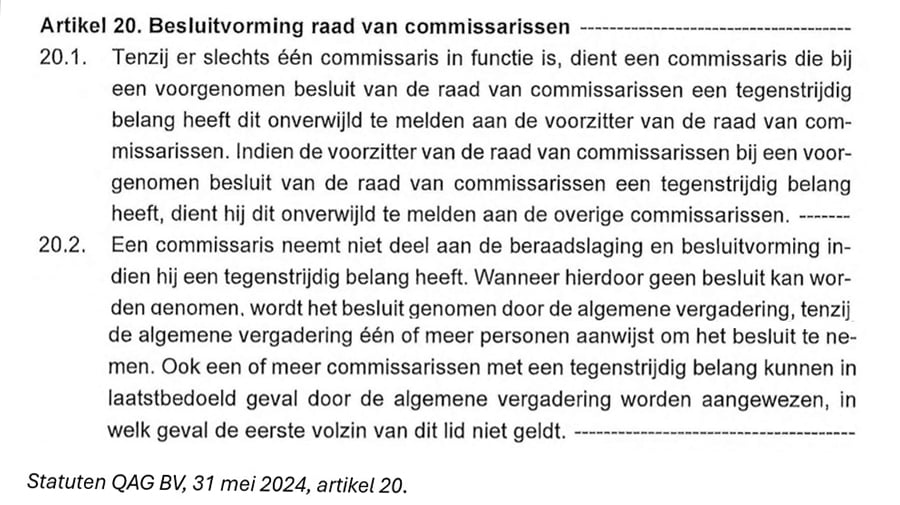 In de statuten is vastgelegd welke bevoegdheden de raad van commissarissen heeft. Naast het recht om bindende voordracht voor de benoeming van bestuurders te doen (artikel 13.3), het mede ondertekenen van de jaarrekening (artikel 22.2) en het vooraf goedkeuren van "alle besluiten van het bestuur omtrent zodanige rechtshandelingen als door de raad van commissarissen duidelijk omschreven en schriftelijk ter kennis van het bestuur zijn gebracht" (artikel 15.10). In geval van een belangenverstrengeling zien commissarissen af van hun stemrecht, zo blijkt uit artikel 20 van de statuten van QAG BV.