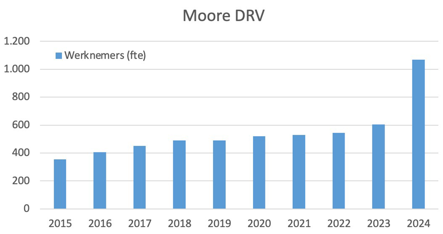 Aantal werknemers Moore DRV 2015-2024 (in fte)