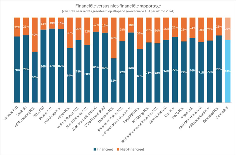 De invoering van de CSRD heeft geleid tot een substantiële toename in duurzaamheidsrapportage. Gemiddeld 26 procent van de jaarverslagen over 2024 van AEX-bedrijven gaat over duurzaamheid, een stijging van 67 procent ten opzichte van 2023. Duurzaamheid is daarmee niet langer een bijlage, maar een integraal onderdeel van de rapportagepraktijk geworden.