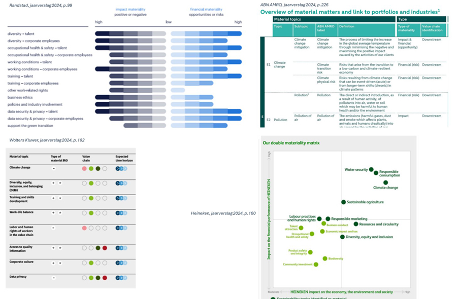 In verschillende jaarverslagen is de koppeling tussen de materiële thema's en de bijbehorende ESRS-standaarden vaak onduidelijk of afwezig. Hoewel de CSRD beoogt duurzaamheid inzichtelijk te maken, belemmert het ontbreken van een uniforme rapportagemethodiek de onderlinge vergelijkbaarheid. Figuur 2 laat een aantal voorbeelden zien hoe de uitkomsten van de materialiteitsanalyse in de verschillende jaarverslagen worden gepresenteerd.