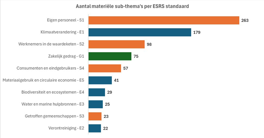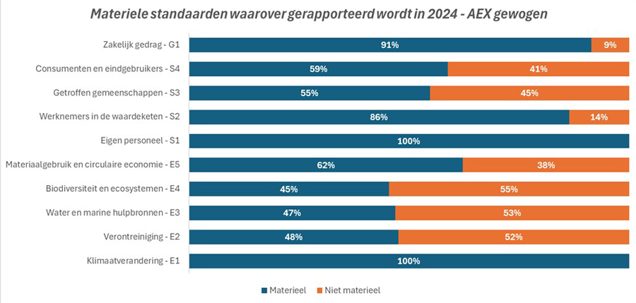De wijze waarop AEX-bedrijven invulling geven aan de rapportageverplichtingen is zeer divers, zowel qua presentatievorm, transparantie als diepgang. Alle AEX-bedrijven beschouwen klimaatverandering (E1) en het eigen personeel (S1) als materieel. Andere standaarden binnen milieu en sociaal worden selectiever gekozen, waarbij grotere bedrijven vaker bredere duurzaamheidsthema’s meenemen zoals biodiversiteit, vervuiling en medewerkers in de waardeketen. In de uitsplitsing naar de ESRS subthema's bestaat de top drie uit beleid met betrekking tot het eigen personeel (S1-1), beleid met betrekking tot medewerkers in de waardeketen (S2-1) en een transitieplan voor het beperken van klimaatverandering (E1-1). Bovendien blijken de bedrijfsomvang en sector waarbinnen een onderneming actief is, van invloed op de relevantie van ESRS-standaarden.