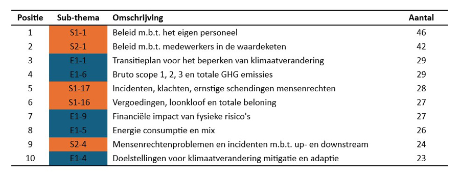 Een nadere analyse van de subthema's laat zien dat van de tien meest gerapporteerde materiële subthema's er vijf onder de milieustandaarden vallen en vijf onder de sociale standaarden (Tabel 1). Op basis van het aantal gerapporteerde materiële subthema’s lijkt de sociale standaard belangrijker dan de milieustandaard. Van de materiële subthema's zijn er in totaal 167 sociaal gerelateerd (55 procent), tegenover 134 milieu gerelateerd (45 procent). De twee belangrijkste subthema’s, S1-1 (beleid m.b.t. het eigen personeel) en S2-1 (beleid met betrekking tot medewerkers in de waardeketen), vallen onder de sociale standaard.