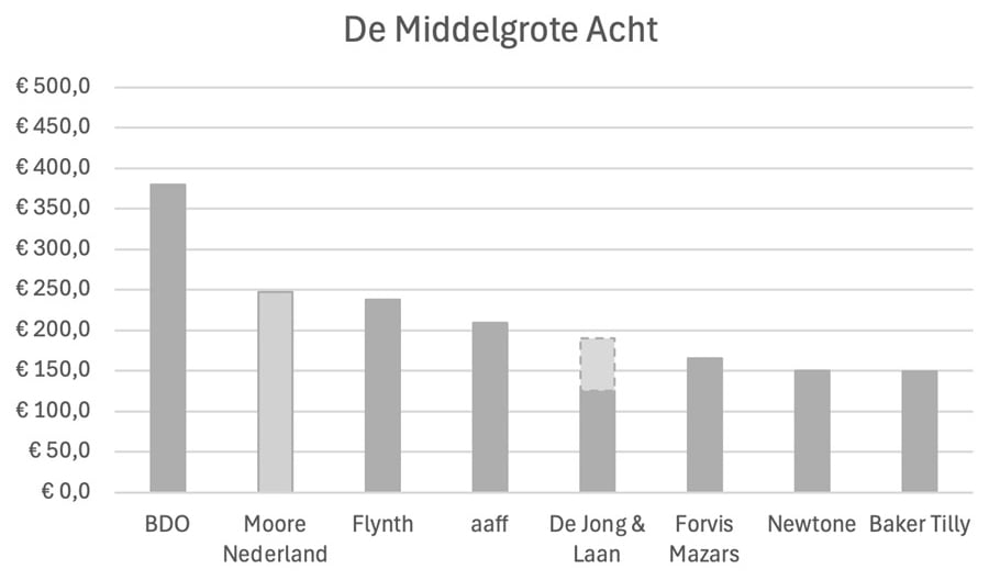 De cijfers van Moore Nederland betreffen die van Moore MKW en Moore DRV opgeteld, de cijfers van De Jong & Laan zijn inclusief die van Crowe Peak en JAN.