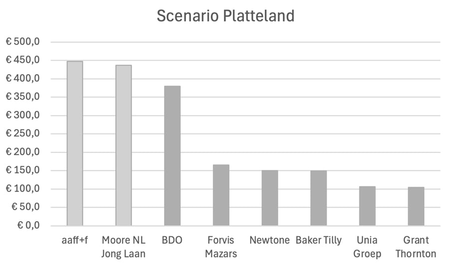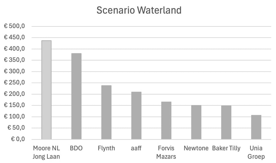 Naar mijn inschatting is Waterland het beste gepositioneerd in deze fase van de consolidatie. Twee samenvoegingen liggen voor de hand: naast de integratie van de Moore-kantoren het Verenigd Koninkrijk, Ierland en de Benelux gaat het in Nederland om een fusie van Moore Nederland en de Jong & Laan. In beide kantoren is Waterland de sleutelinvesteerder. In het geval van die fusie zal een partij ontstaan die de sinds jaar en dag stevig op nummer 5 gepositioneerde speler in de markt, BDO, zal overtoepen. In dat scenario ziet de subtop er als volgt uit.