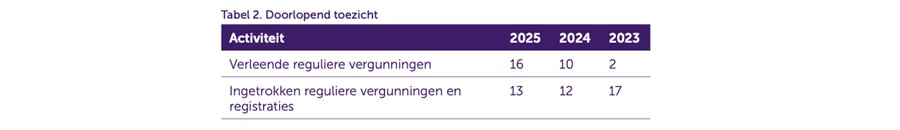 Gedurende 2025 verleende de AFM zestien Wta-vergunningen aan accountantsorganisaties en werden er dertien vergunningen ingetrokken. Ultimo 2025 zag de AFM toe op opgeteld 225 geregistreerde reguliere vergunninghouders. Het aantal onder AFM-toezicht staande accountantskantoren lijkt daarmee uit te bodemen.