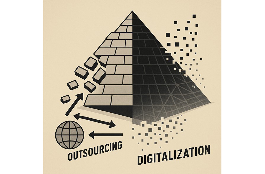 Maar die piramide staat onder druk. Niet een beetje, maar fundamenteel. Twee krachten vreten aan de brede basis die het fundament van de sector vormt: digitalisering en outsourcing door demografische krapte. Samen zorgen ze ervoor dat het instapwerk, ooit de leerschool voor starters, sneller verdwijnt dan velen beseffen. De centrale vraag is dan: wat betekent dit voor de toekomst van accountantsorganisaties? Hoe organiseer je een sector die decennialang vertrouwde op een breed fundament van instromende jongeren, als dat fundament steeds smaller wordt?