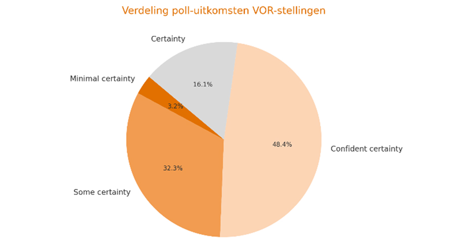 - Some certainty (32 procent) werd vooral gekozen door organisaties die actief zijn in een internationaal speelveld. Voor hen is de VOR een ontwikkeltraject ('een reis'), waarbij verschillen in cultuur, governance, toezicht en aansprakelijkheid meespelen. Deze context vraagt om zorgvuldigheid in de formulering van de verklaring.