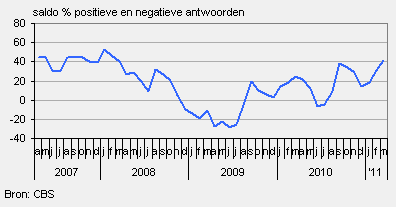 Het saldo kwam uit op +41, tegen +31 in februari. Vooral bij de uitzendbureaus en bij accountants en economische adviesbureaus is het optimisme over de toekomstige omzet groot.