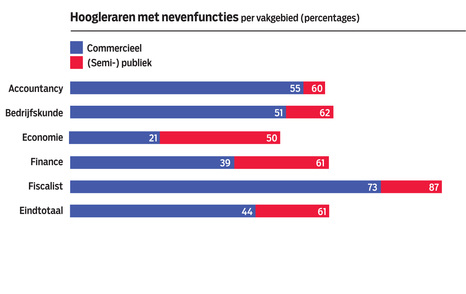 Van de bijna zeshonderd hoogleraren economie, finance, accountancy, bedrijfskunde en fiscaal recht heeft 44 procent één of meer nevenfuncties in het bedrijfsleven, becijferen journalist Koen Haegens en onderzoeker Reinier Bijman in de editie van deze week. Nog eens zeventien procent is actief in de (semi-)publieke sector.