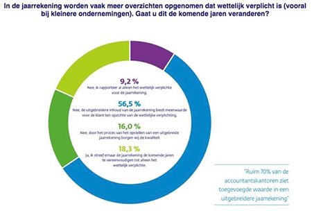 Opvallend is dat slechts 18 procent van de 140 deelnemende accountants de doelstelling heeft om de jaarrekening te vereenvoudigen tot het wettelijke verplichte. Ruim 56 procent ziet meerwaarde voor de klant van de extra overzichten. "Opmerkelijk, aangezien er veel discussies gaande zijn over dat de jaarrekening direct in de onderste la van de ondernemer belandt", concludeert de softwareleverancier.