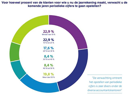 Dit zijn vooral kleinere organisaties. Reden hiervan is dat deze kantoren relatief veel administratieve dienstverlening doen en zij hierbij periodiek cijfers uit het boekhoudsysteem verschaffen. 46 procent geeft aan voor minder dan 20 procent van de klanten tussentijdse cijfers te verstrekken.