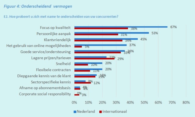 Nederlandse accountants lopen op enkele punten sterk voorop ten opzichte van de andere landen. Ruim een derde (37 procent) van de Nederlandse ondervraagde accountants probeert technologie te gebruiken om zich te onderscheiden van de concurrentie. In de andere landen is dat gemiddeld niet meer dan vijf procent.