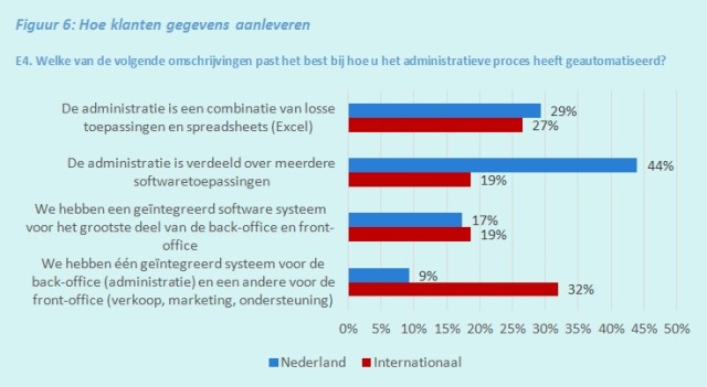 Uit het onderzoek blijkt dat slechts 9 procent van de bevraagde Nederlandse accountants één geïntegreerd systeem heeft voor back-office (administratie) en front-office (verkoop, marketing, ondersteuning) ten opzichte van 32 procent in het buitenland.