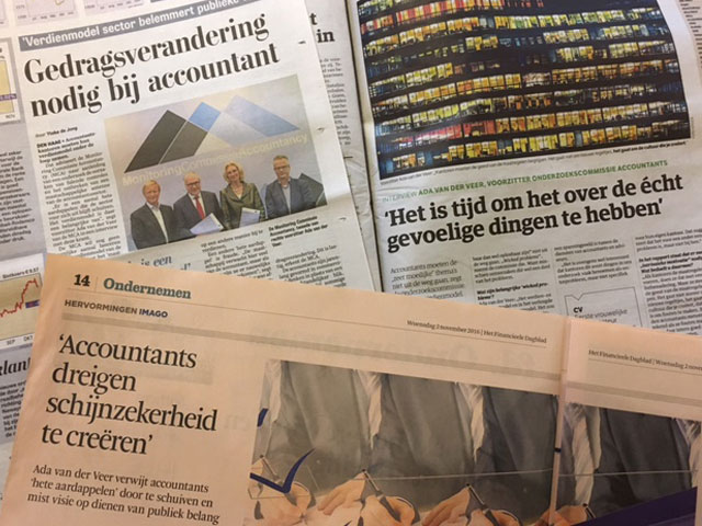 De media pikken het eerste rapport van de monitoringcommissie gretig op. "Hard oordeel over accountants", schrijft NRC Handelsblad van 1 november op de voorpagina. In een aanvullend interview met NRC Next benadrukt commissievoorzitter Ada van der Veer dat het nu tijd is voor de sector "om het over de écht gevoelige dingen te hebben". Belangrijk is de intrinsieke motivatie bij accountants om ook de geest van de maatregelen te begrijpen: "Het gaat niet zozeer om nieuwe regeltjes, het gaat om de cultuur die je creëert, dat er ruimte is om fouten te maken."
