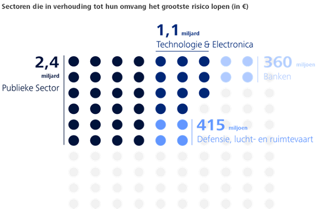 Het onderzoek richt zich op de meest relevante economische sectoren van Nederland. Uit de data-analyse blijkt dat als het gaat om cyberdreigingen, momenteel de volgende vier sectoren in verhouding tot hun omvang het grootste risico lopen: de publieke sector (totaal 2,4 miljard euro verwacht waardeverlies op jaarbasis), de technologie- & elektronicasector (1,1 miljard euro), de bankensector (360 miljoen euro) en de defensie-, luchtvaart- en ruimtevaartsector (415 miljoen euro).